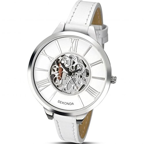 This ladies Sekonda watch has a stainless steel case and is fitted with a quartz movement. It is fitted with a white leather strap and has a skeleton dial.